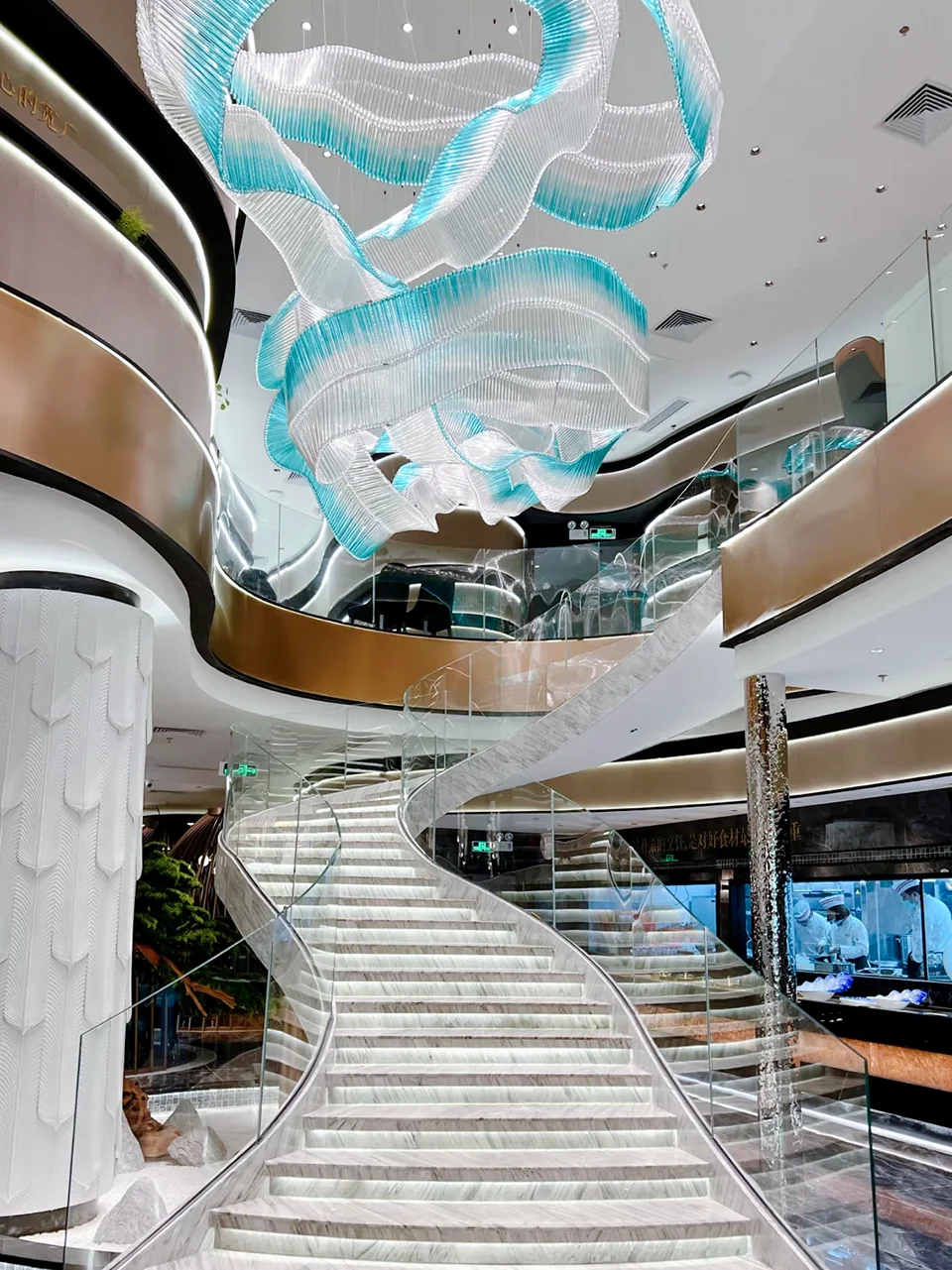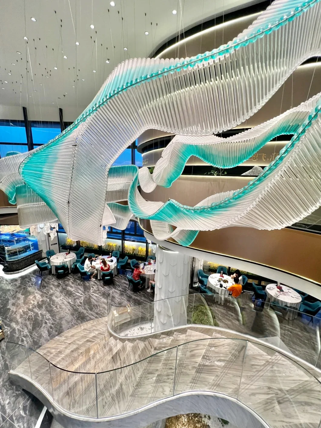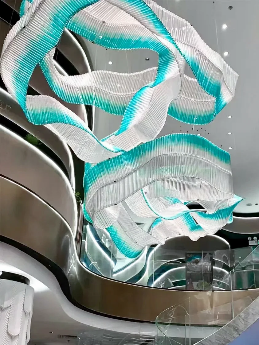 This is an artistic ribbon chandelier made of thin glass tubes, which can be designed into various winding and intricate shapes. It is suitable for installation in various spaces such as hotel lobbies, sales offices, large shopping malls, restaurant lobbies, and art galleries.