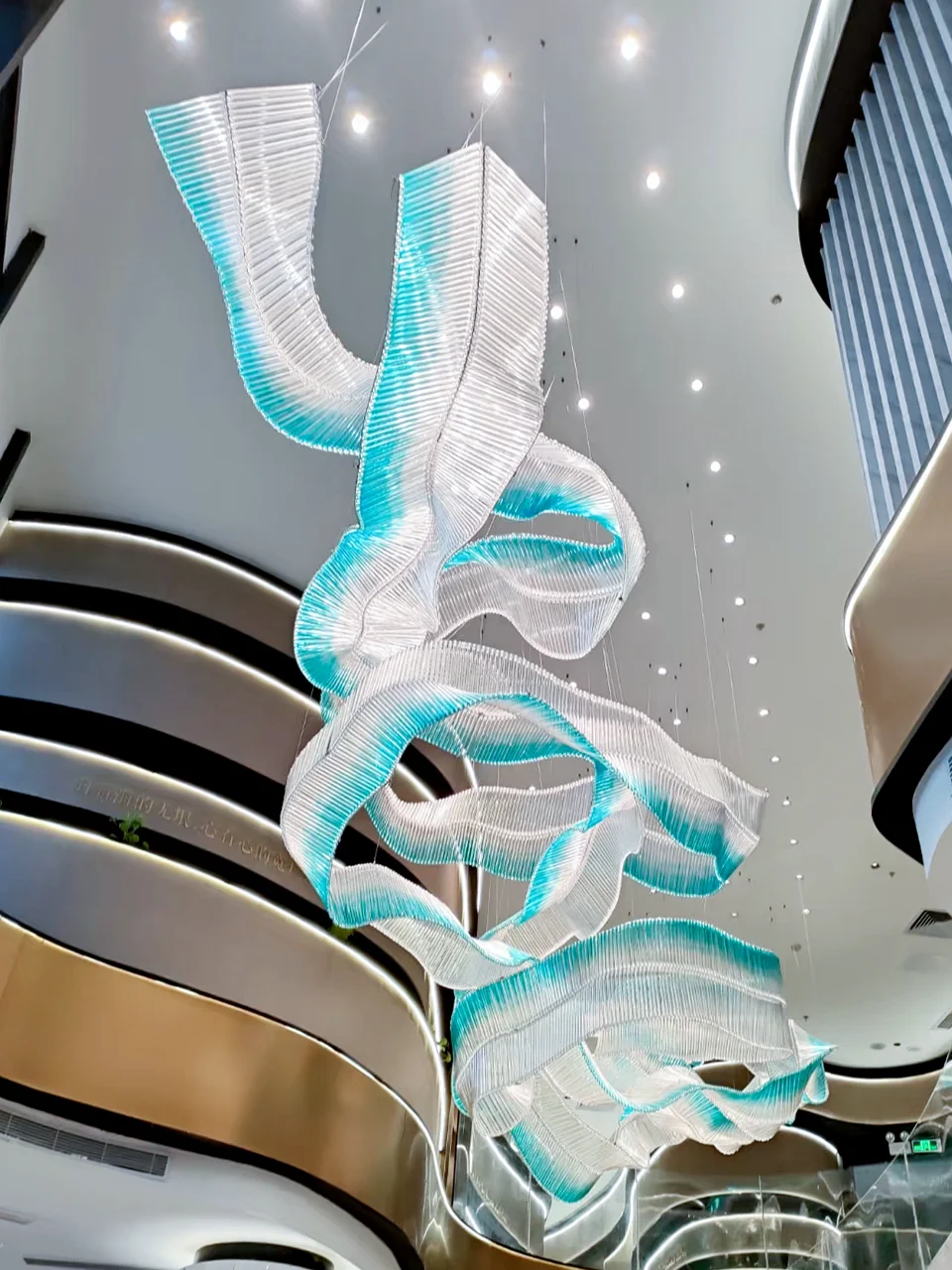 Custom-designed blue gradient artistic ribbon chandelier for hotel lobby and shopping center; high-end customization from a lighting factory.