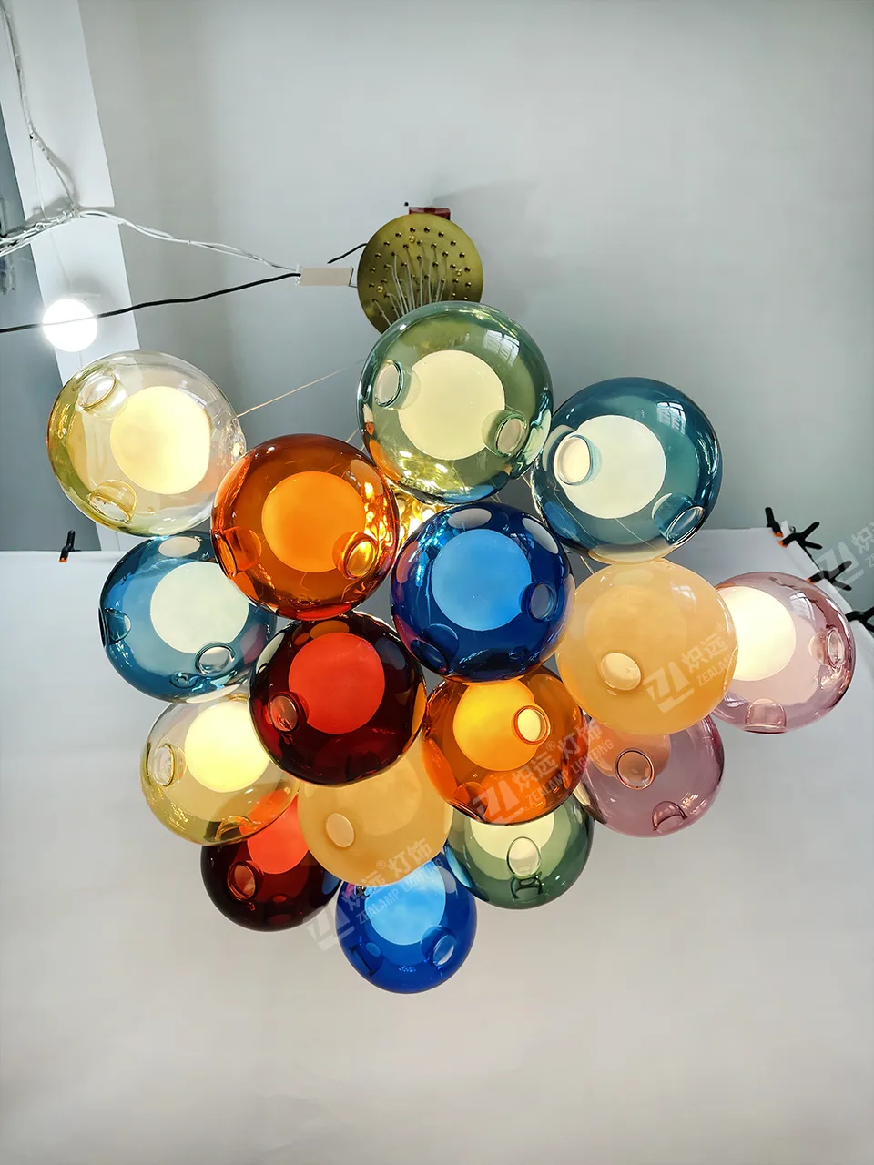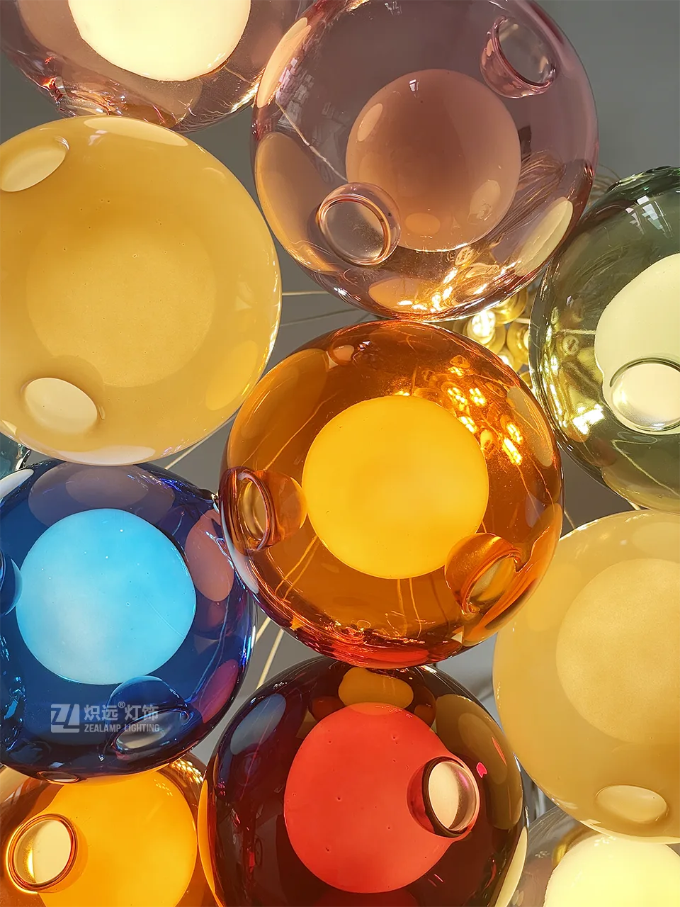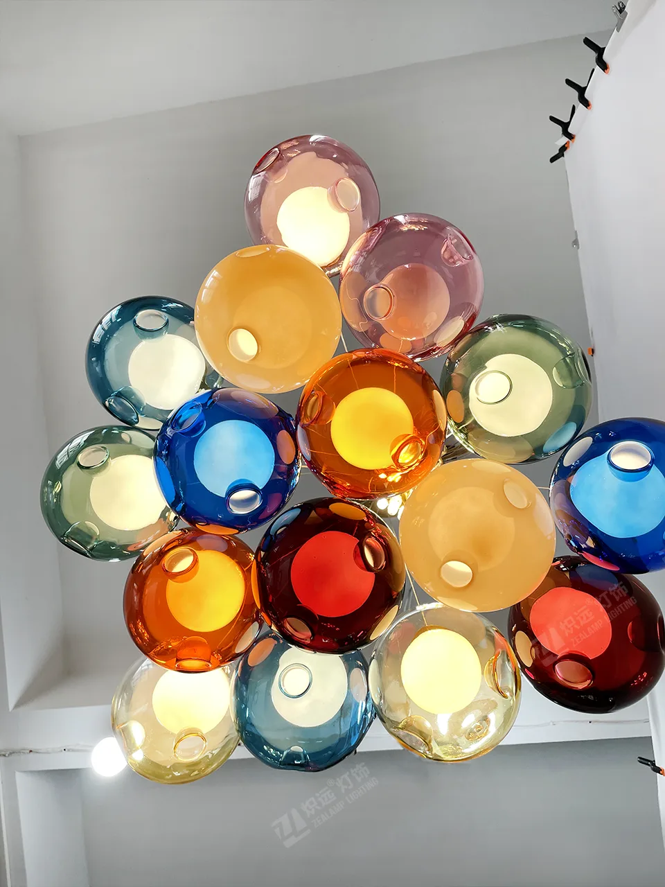 This chandelier features a unique glass globe lampshade design, offering a variety of colors—red, orange, yellow, blue, and green—that freely combine to create a vibrant, vibrant collection of bubbles. The glass’s excellent light transmittance allows light to gently filter through the multicolored glass, creating a dreamy and warm ambiance.