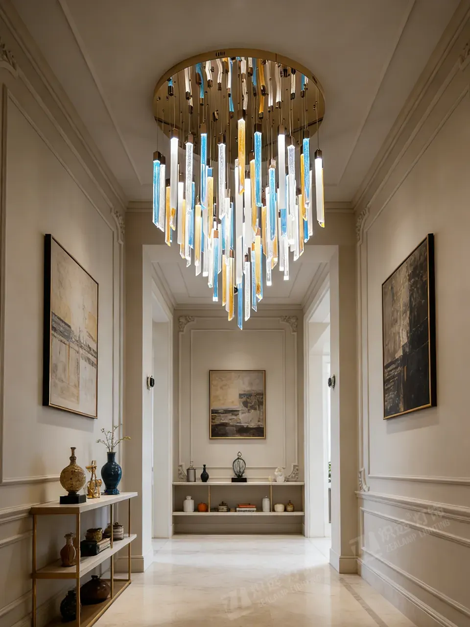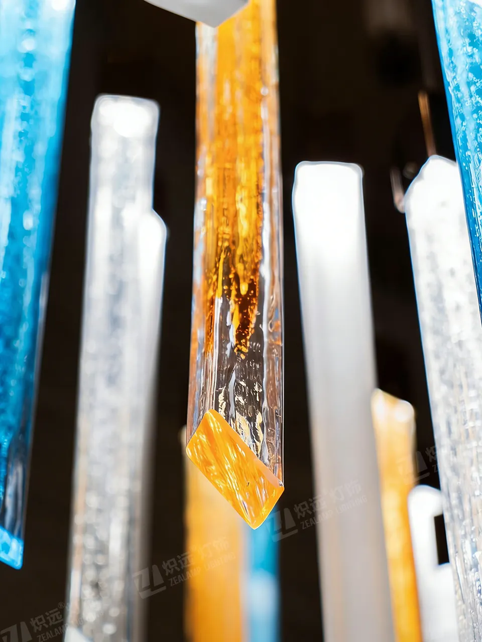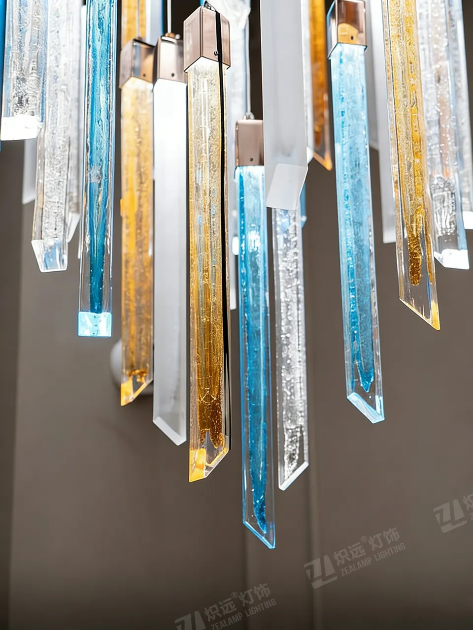This chandelier centers on multi-color square glass columns, mixing transparent, blue and yellow shades with a metal ceiling plate. When lit, light passes through the textured glass, creating a soft yet layered effect.