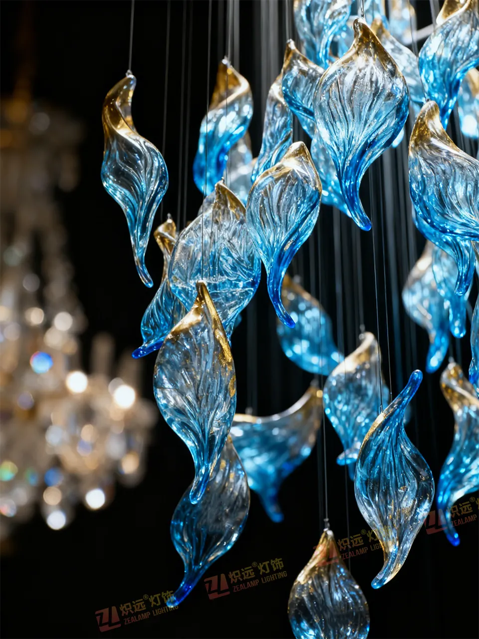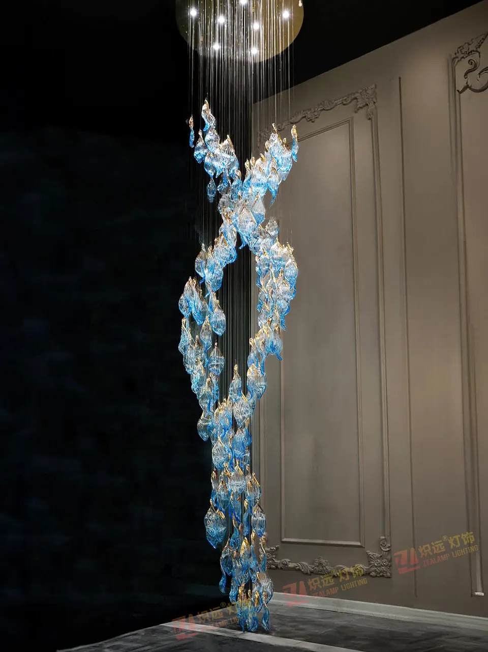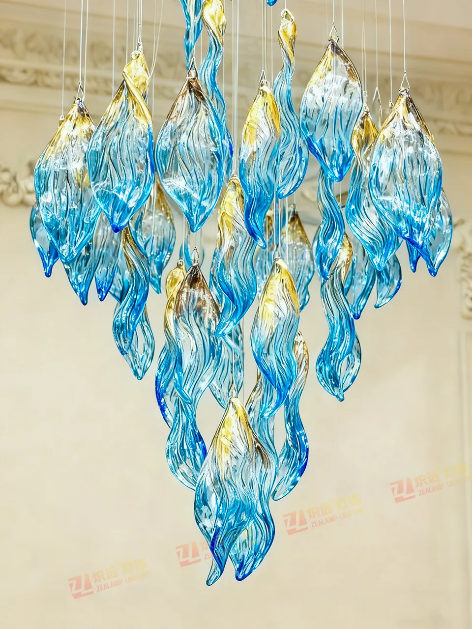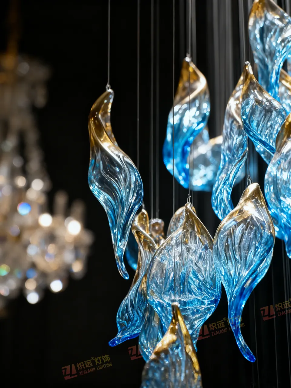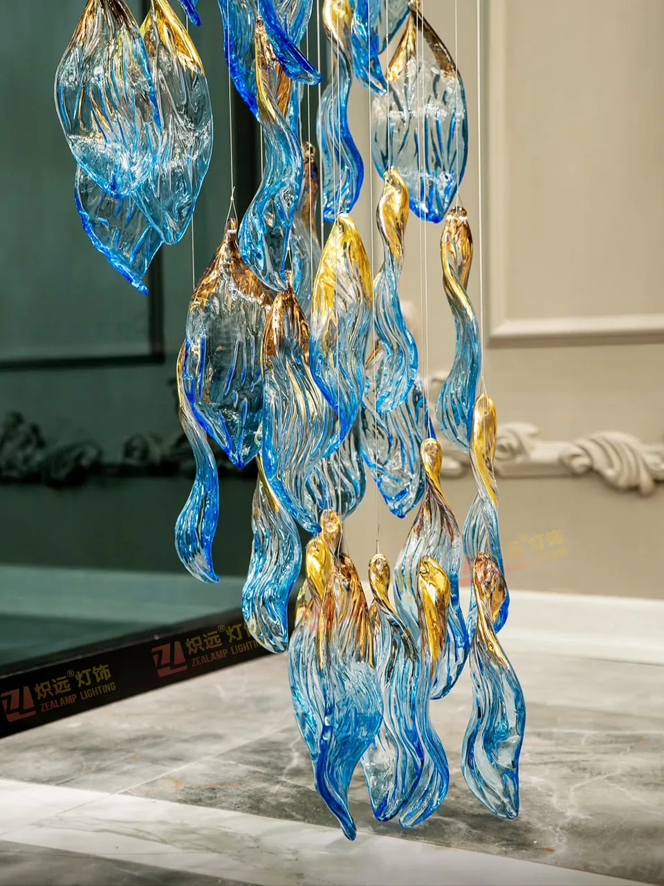 This artistic glass chandelier redefines luxury lighting with its leaf-shaped blue glass pendants—each edged in gleaming gold for a striking contrast between cool transparency and warm opulence. It transforms any space it inhabits: hang it in a villa’s living room, and it becomes the centerpiece, catching natural light through floor-to-ceiling windows to cast shimmering blue-gold hues across marble floors and plush seating. In a spiral staircase, its cascading, organic form follows the curve of the steps, turning a functional area into a gallery-worthy display.