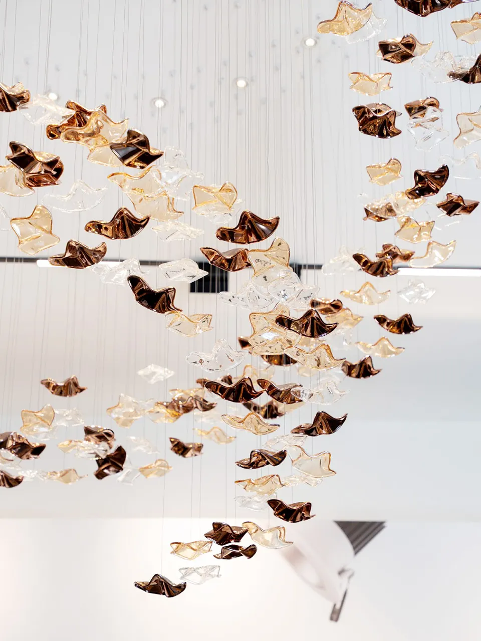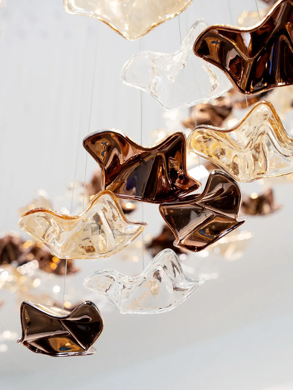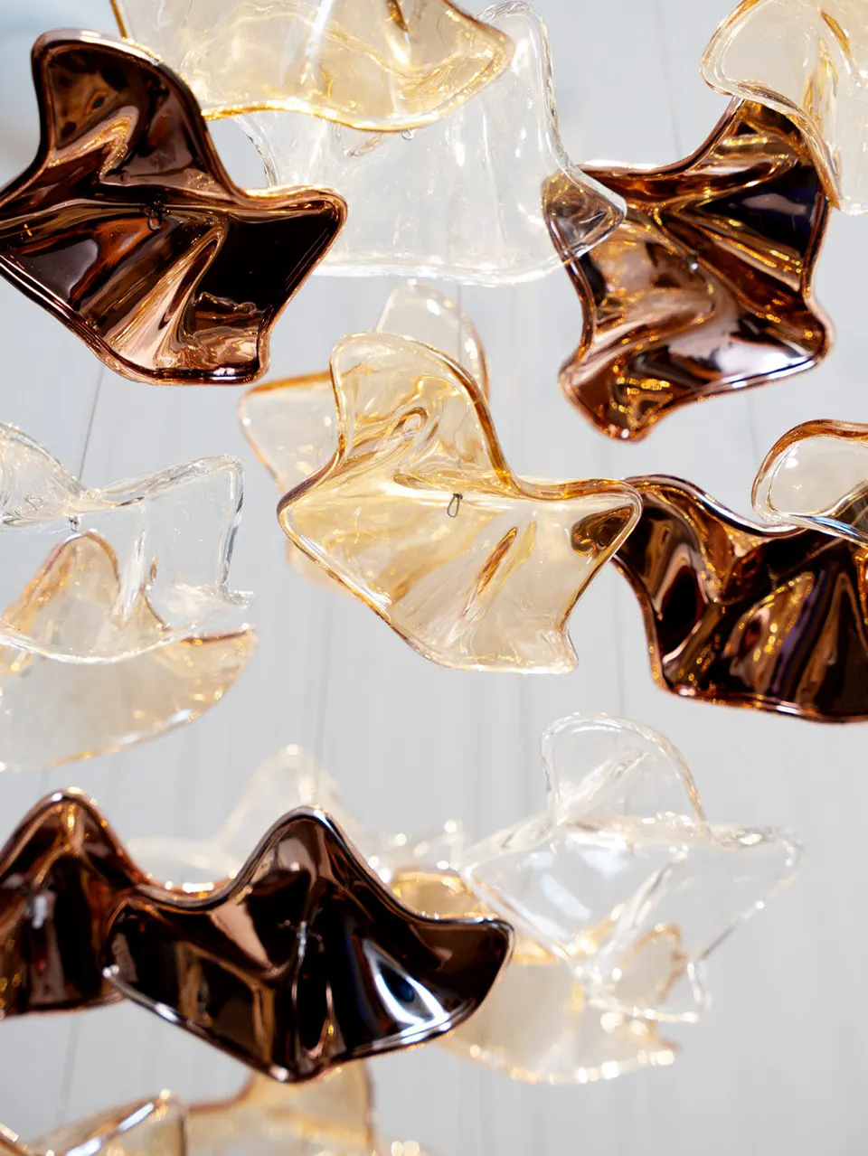 Centered on the “flowing wave” design, this art glass chandelier uses gradient amber + transparent glass to shape a undulating texture. Thin hanging wires make each wavy glass piece seem to gently ripple in the space.